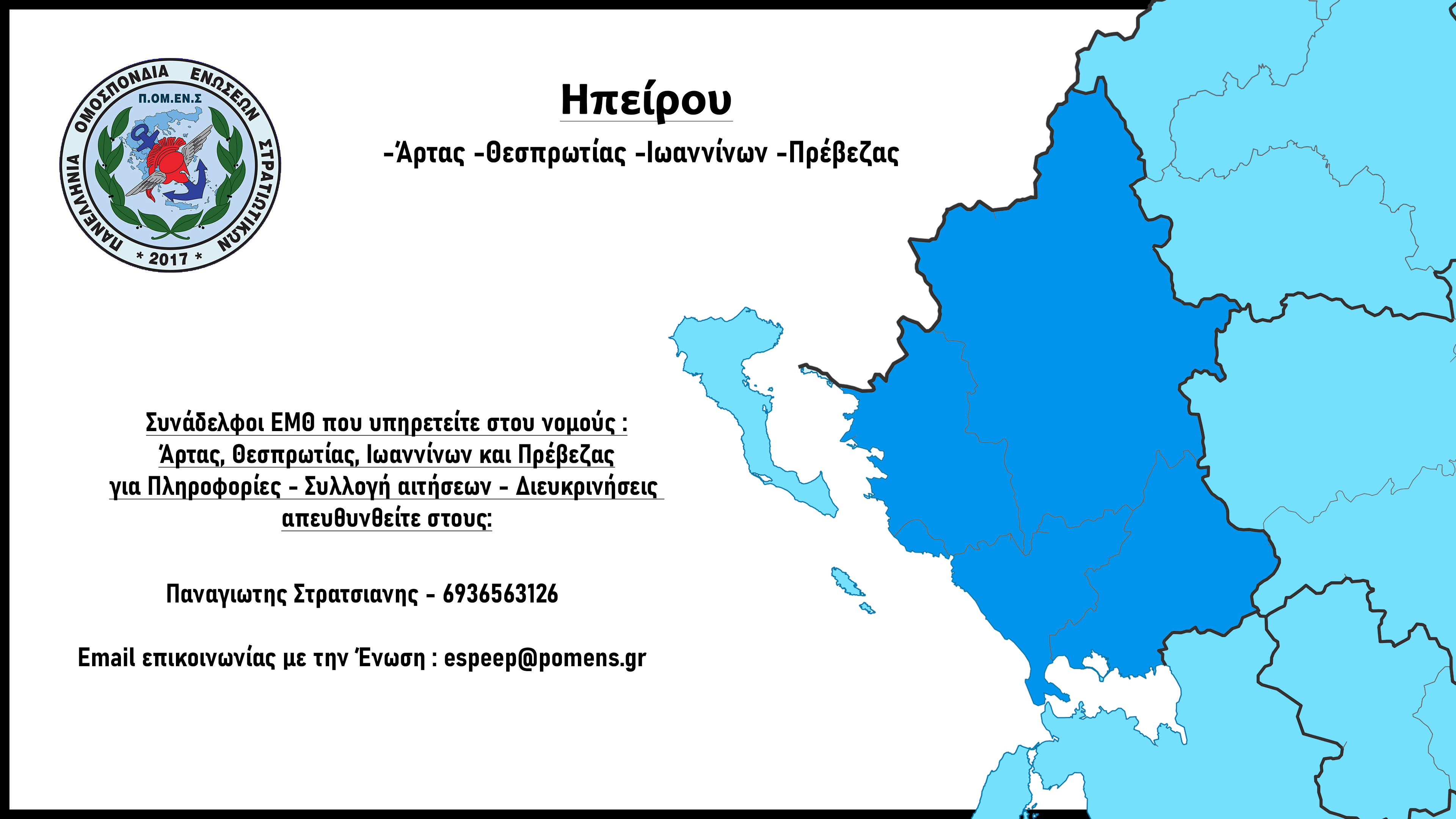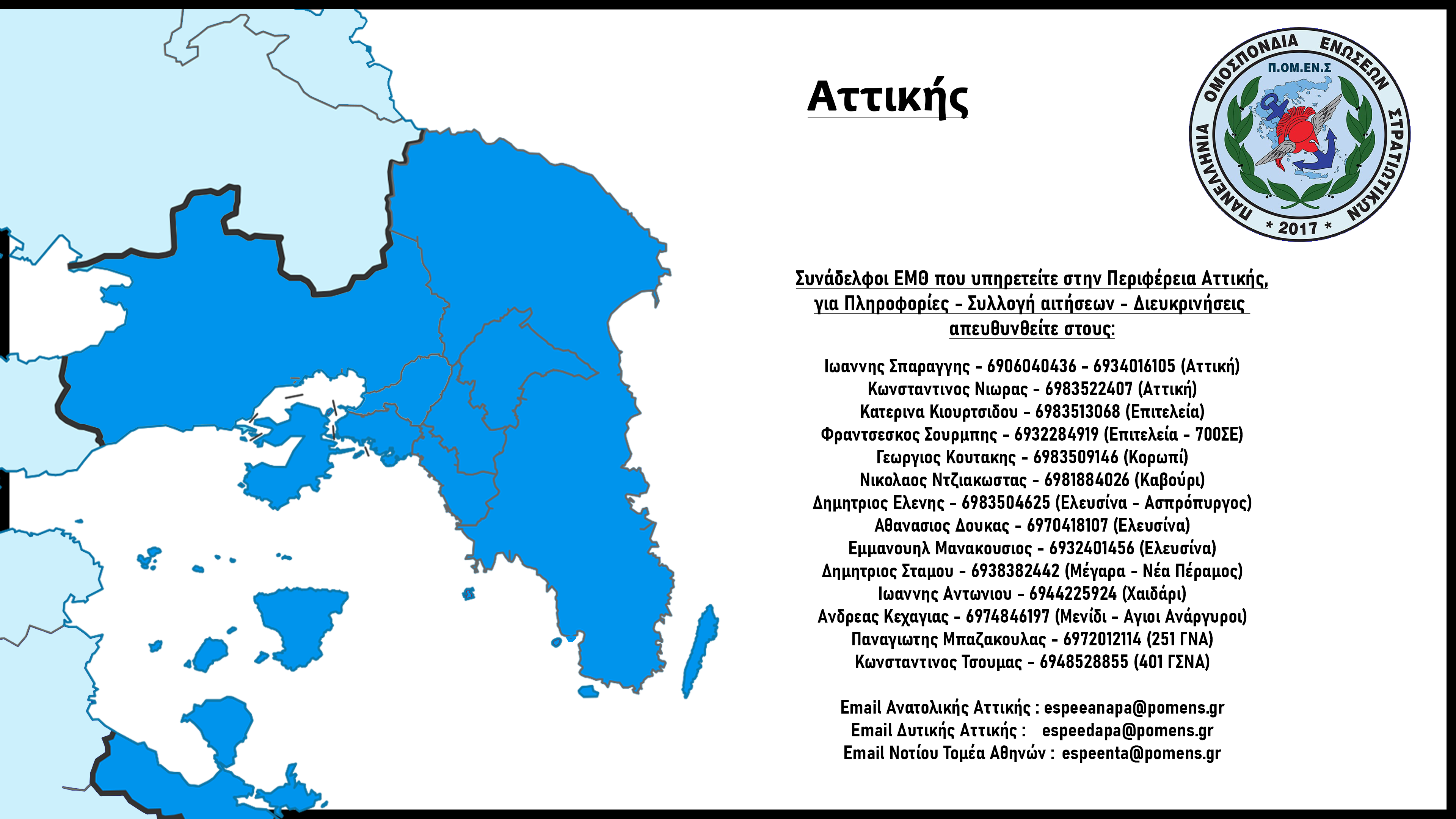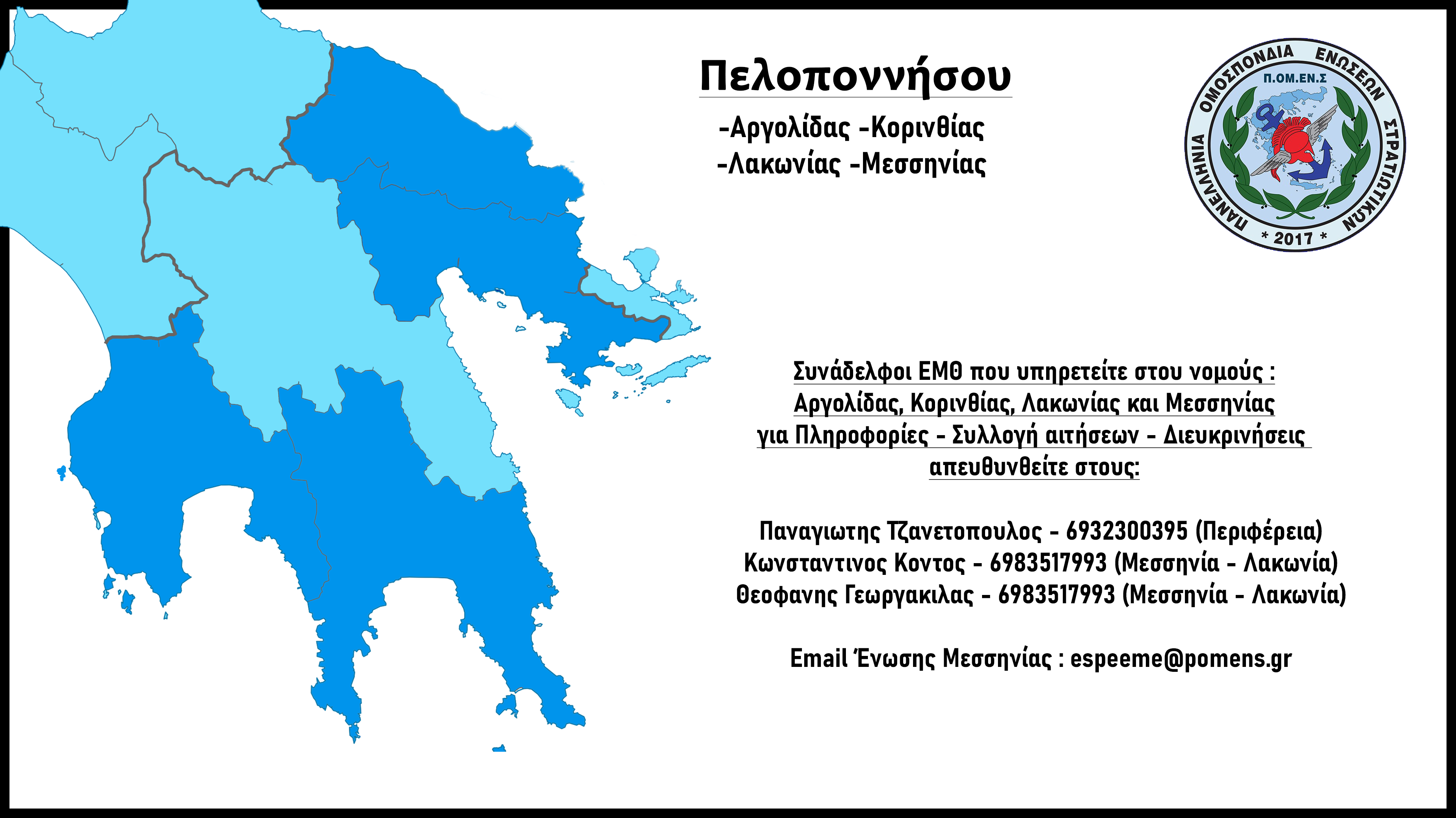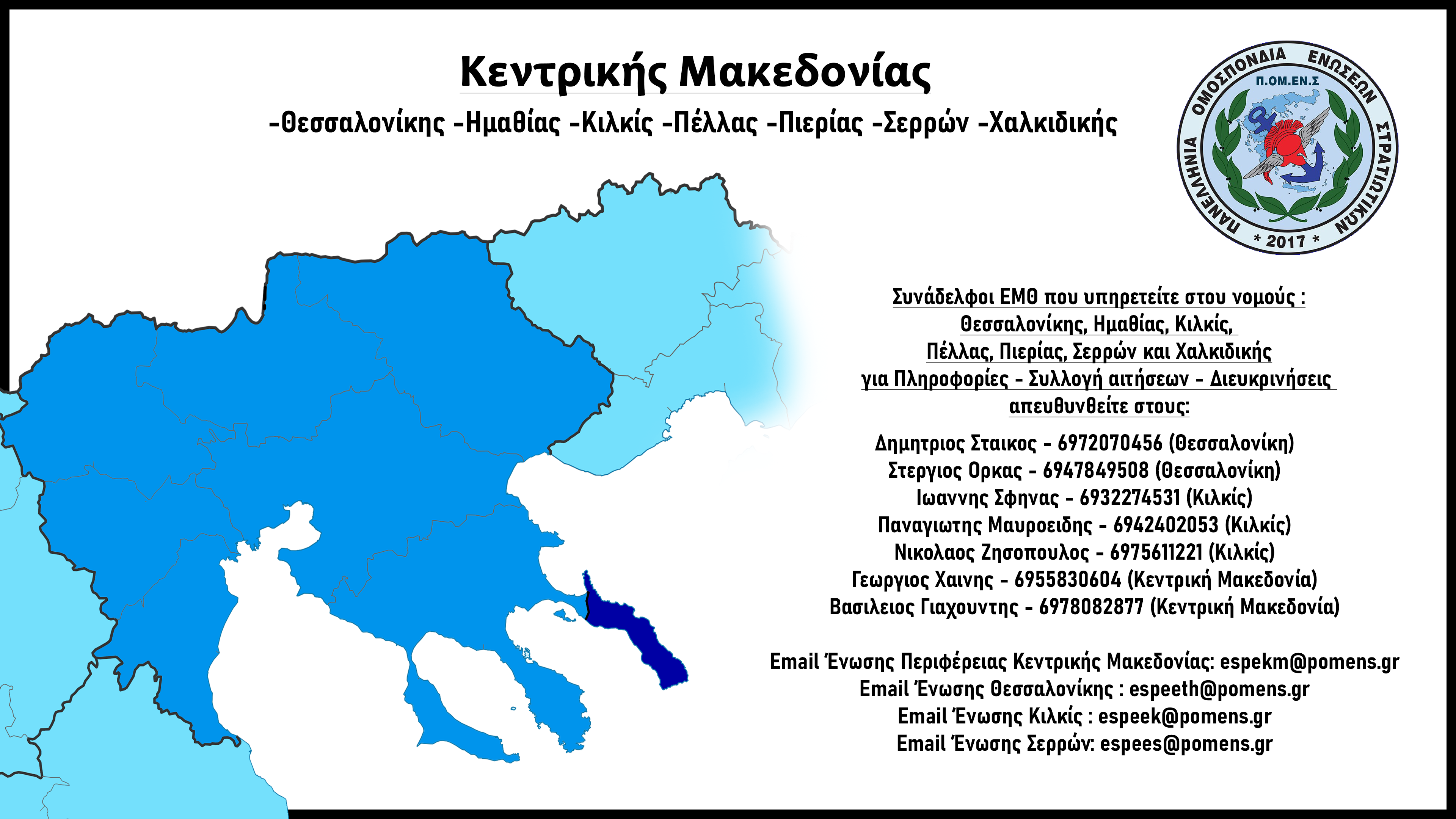 - Θα απευθύνεστε στην πλησιέστερη Ένωση Στρατιωτικών όπως περιγράφονται στους συνημμένους πίνακες αφού έχετε υποβάλει ηλεκτρονική εγγραφή. Η κατάθεση των δικαιολογητικών θα γίνεται στην πλησιέστερη Ένωση κατόπιν συνεννόησης με το αρμόδιο άτομο που έχει καθορίσει το αντίστοιχο ΔΣ.