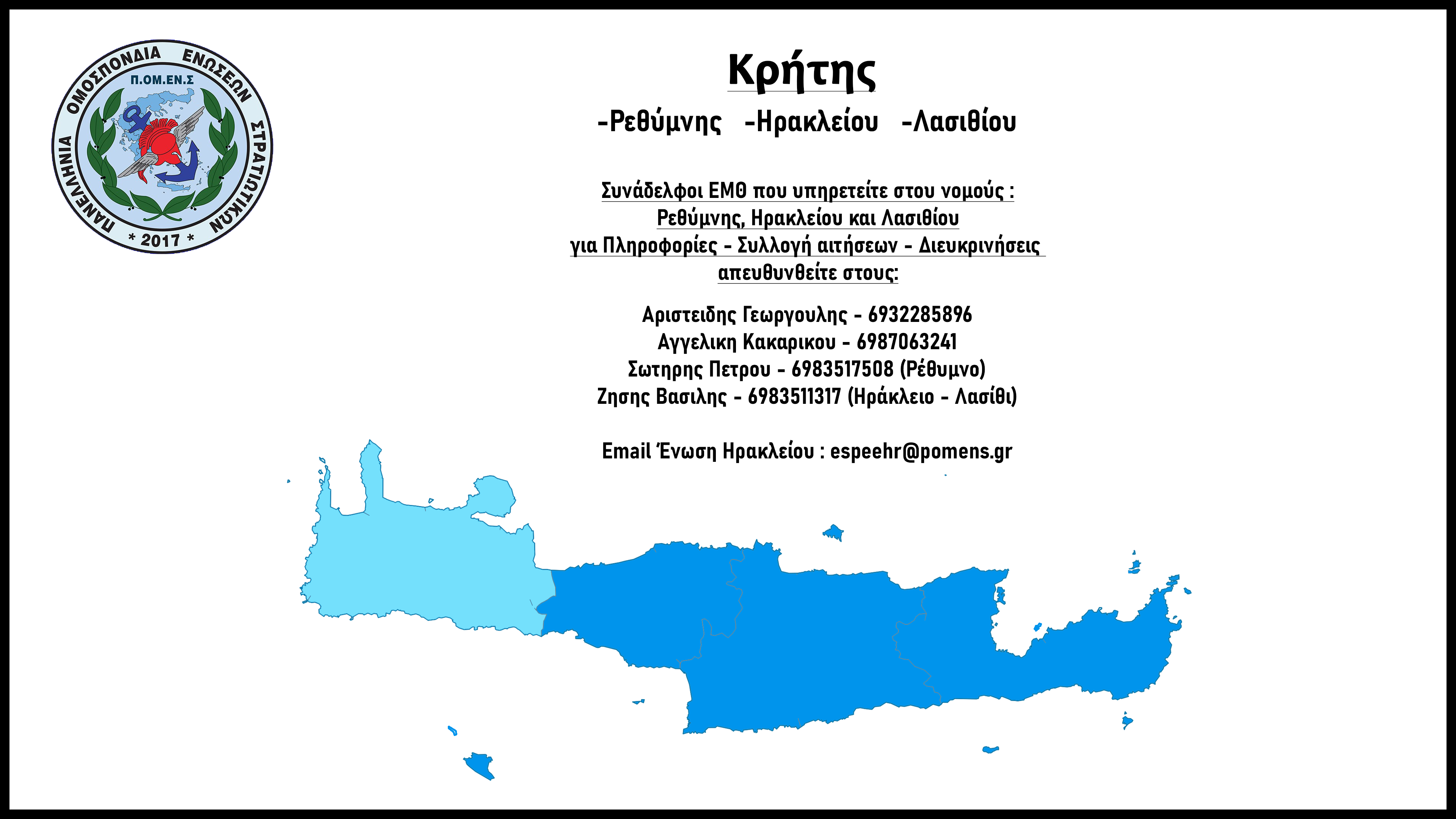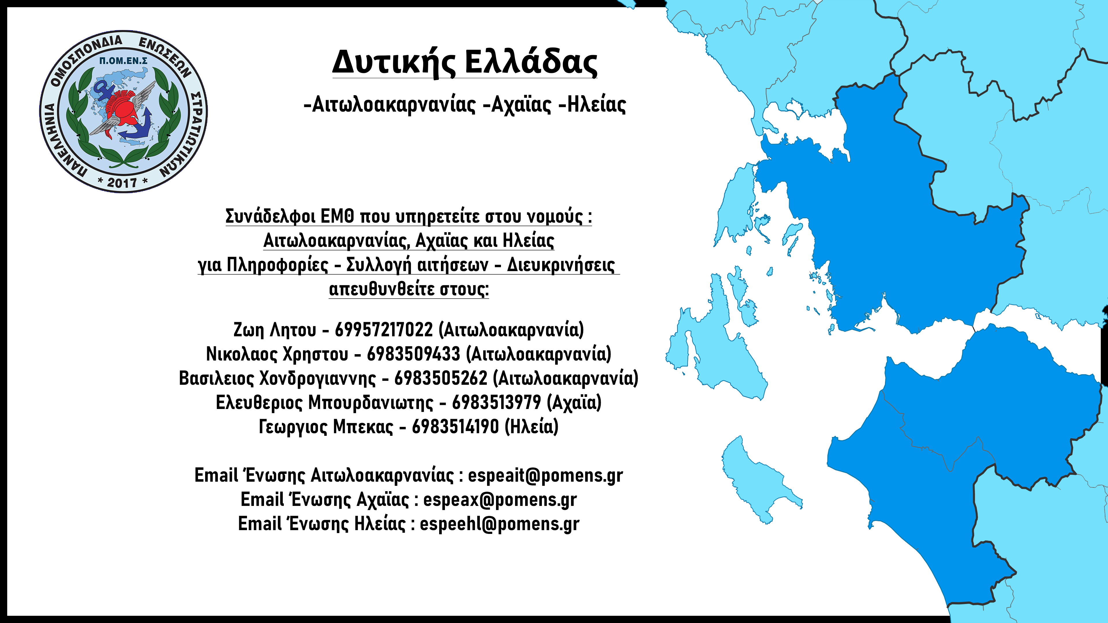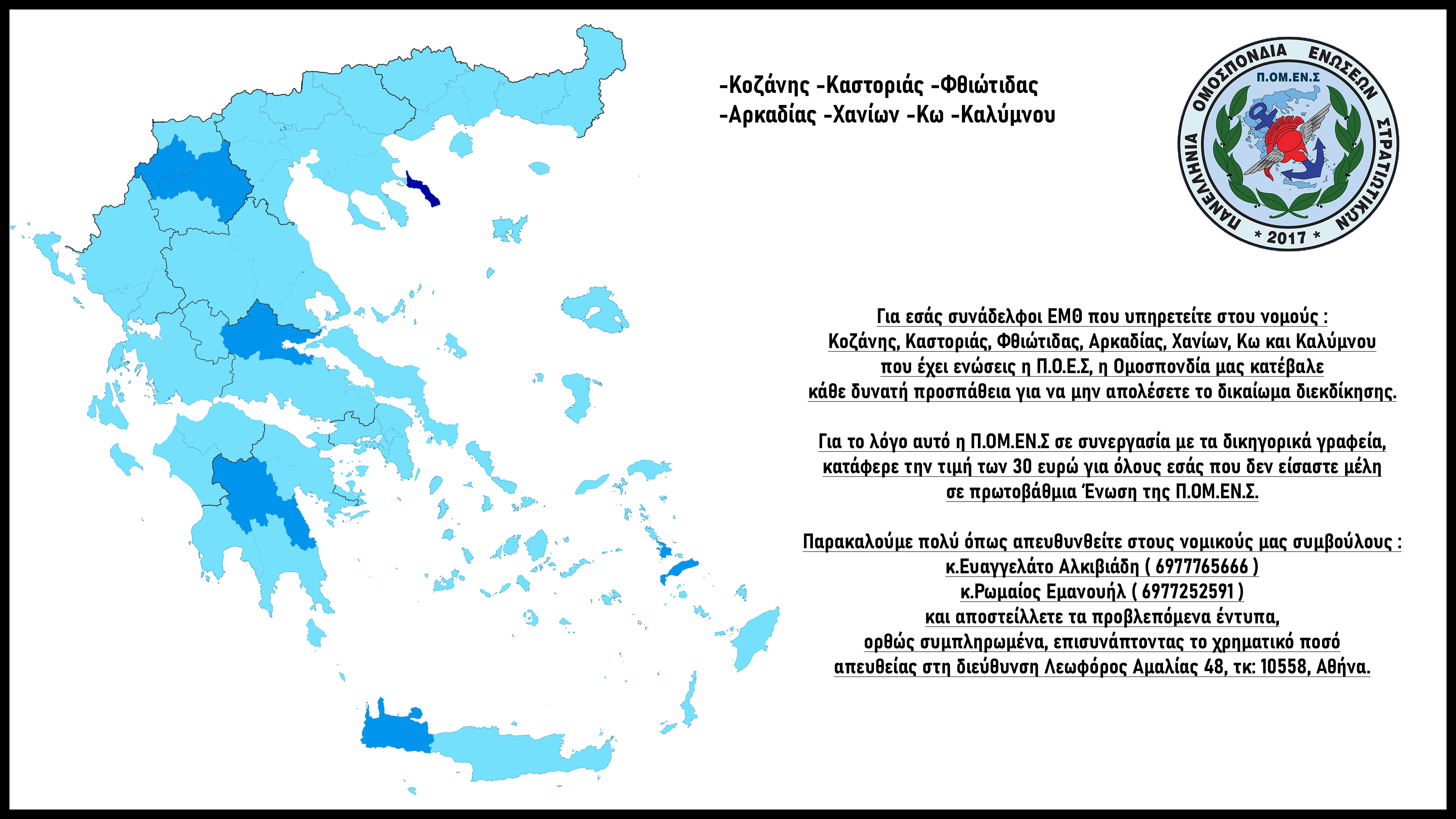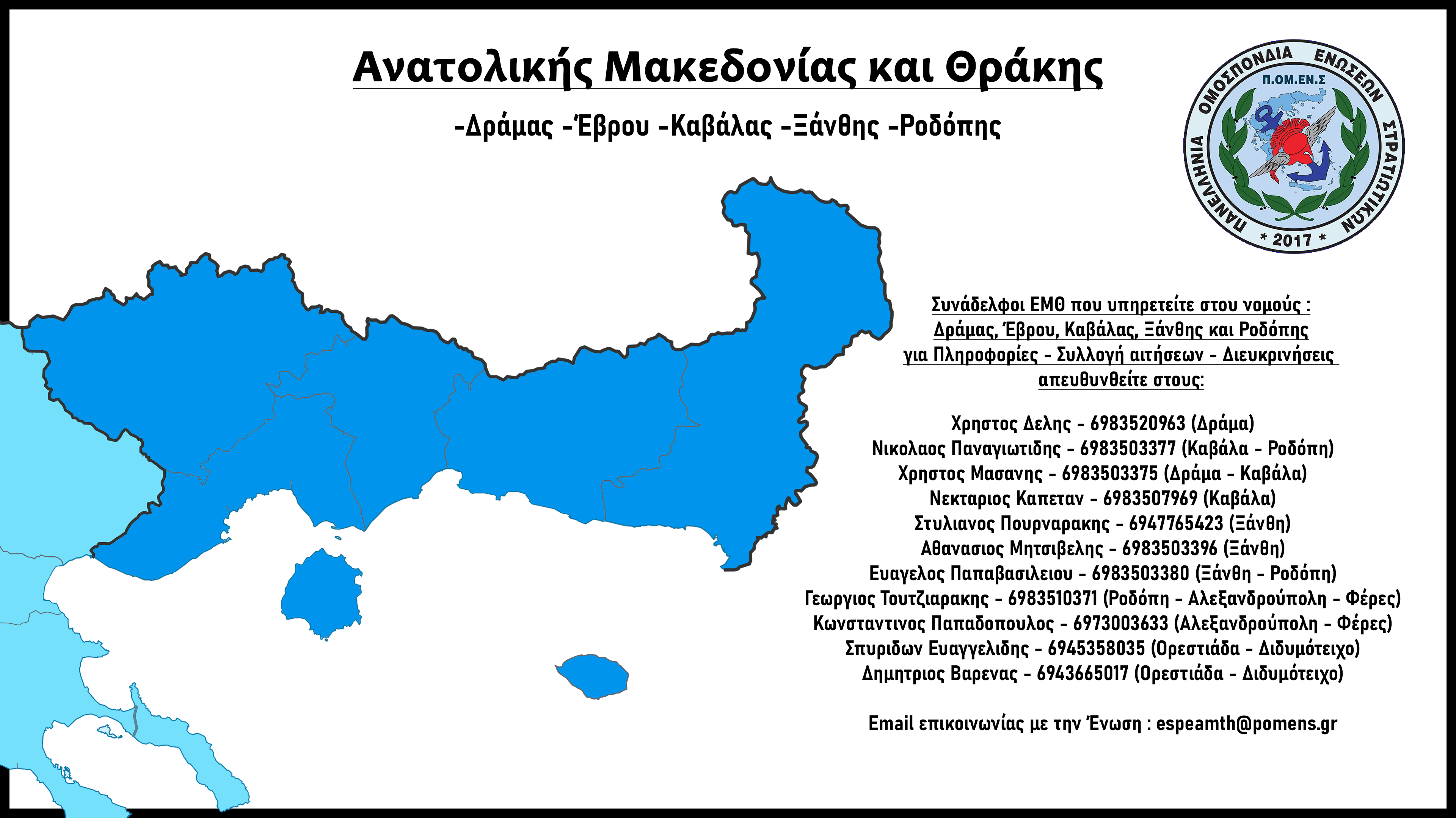 - Θα απευθύνεστε στην πλησιέστερη Ένωση Στρατιωτικών όπως περιγράφονται στους συνημμένους πίνακες αφού έχετε υποβάλει ηλεκτρονική εγγραφή. Η κατάθεση των δικαιολογητικών θα γίνεται στην πλησιέστερη Ένωση κατόπιν συνεννόησης με το αρμόδιο άτομο που έχει καθορίσει το αντίστοιχο ΔΣ.