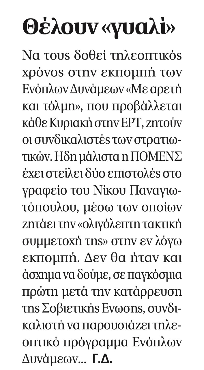 2. Η ΠΟΜΕΝΣ, με τον πλέον επίσημο τρόπο, ως θεσμική εκπρόσωπος των εν ενεργεία στρατιωτικών, ζήτησε να έχει ολιγόλεπτη συμμετοχή στην τηλεοπτική εκπομπή του εργοδοτικού της Φορέα που πραγματεύεται θέματα του Υπουργείου Εθνικής Άμυνας.