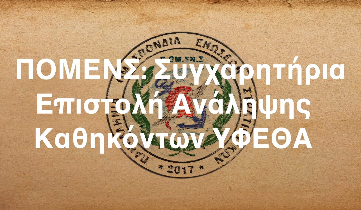 1. Η Πανελλήνια Ομοσπονδίας Ενώσεων Στρατιωτικών - Π.ΟΜ.ΕΝ.Σ., επί τη ευκαιρία της ανάληψης των νέων σας καθηκόντων ως Υφυπουργού Εθνικής Άμυνας, σας εκφράζει τα θερμά μας συγχαρητήρια και τις ευχές μας για κάθε επιτυχία στο δύσκολο ομολογουμένως έργο το οποίο αναλαμβάνετε.