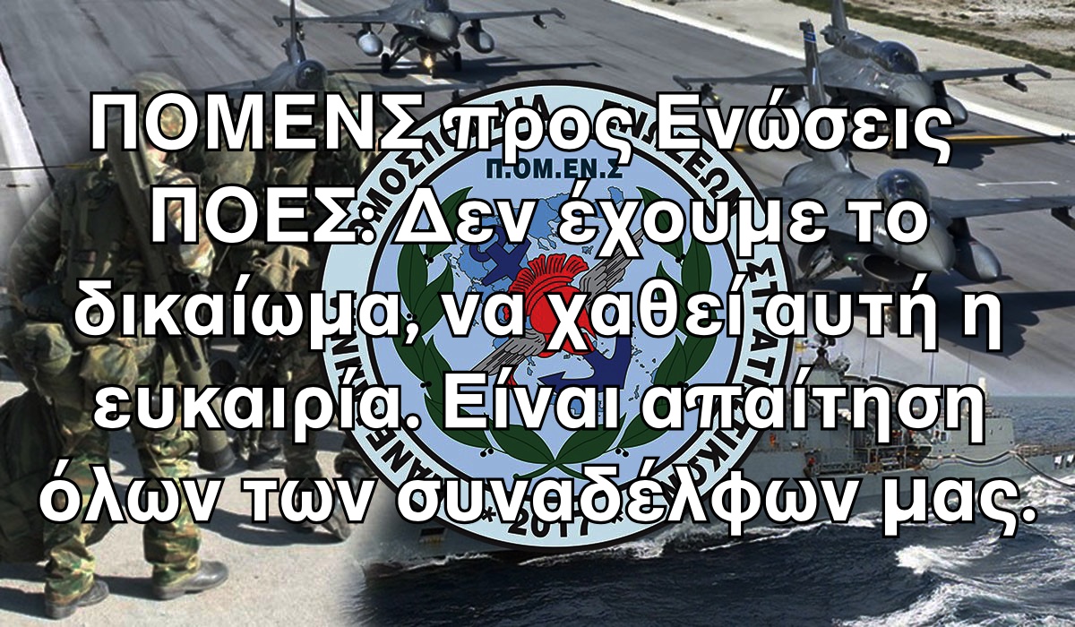 Το Διοικητικό Συμβούλιο της Πανελλήνιας Ομοσπονδίας Ενώσεων Στρατιωτικών - ΠΟΜΕΝΣ, με πρόσφατη απόφασή του, αποφάσισε τη συγκρότηση Επιτροπής από πλευράς της ΠΟΜΕΝΣ με την συμμετοχή του νομικού της συμβούλου, με στόχο την δημιουργία των προϋποθέσεων για την επίτευξη ενότητας στο χώρο της θεσμικής εκπροσώπησης των Ενόπλων Δυνάμεων.