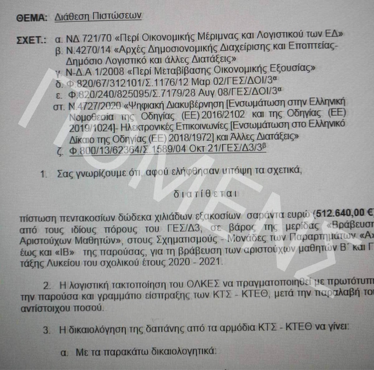 να προβεί στην καταβολή του επιδόματος Βράβευσης Αριστούχων Μαθητών (ΒΑΜ), Β΄ και Γ΄ τάξης Λυκείου του Σχολικού Έτους 2020 – 2021 οι οποίοι έχουν συγκεντρώσει υψηλή βαθμολογία.