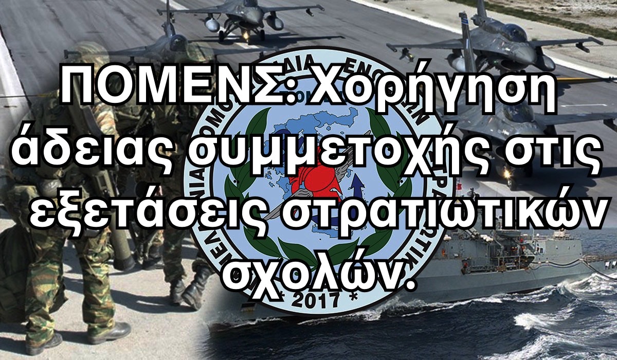 Η Πανελλήνια Ομοσπονδία Ενώσεων Στρατιωτικών - ΠΟΜΕΝΣ, χαιρετίζει την απόφαση του Γενικού Επιτελείου Εθνικής Άμυνας (ΓΕΕΘΑ) να προβεί στην χορήγηση ειδικής αδείας, πέραν των προβλεπόμενων, στις/στους συναδέλφους μας, οι οποίες/οποίοι έχουν τέκνα τα οποία θα συμμετάσχουν στις Προκαταρκτικές Εξετάσεις (ΠΚΕ) για την εισαγωγή τους στα ΑΣΕΙ- ΑΣΣΥ για το ακαδημαϊκό έτος 2022-23 υιοθετώντας την πρόταση που είχαμε καταθέσει με το με το υπ΄αριθμό 52/02-03-22 έγγραφο μας https://www.pomens.gr/enimerosi/epistoles/1817-pomens-eksetaseis-eisagogis-se-stratiotikes-sxoles-xorigisi-eidikis-adeias, παρέχοντας τους τις απαραίτητες διευκολύνσεις καθώς σε πολλές των περιπτώσεων θα χρειαστεί να μετακινηθούν σε διαφορετικές περιοχές από τον τόπο διαμονής τους, προσφέροντας τους παράλληλα την αναγκαία συναισθηματική και ψυχολογική στήριξη.