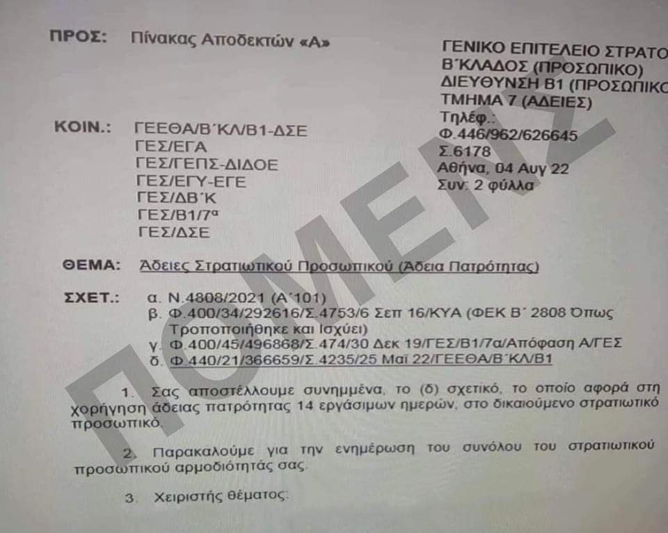 Συγκεκριμένα με έγγραφο της Αντιπροεδρίας Μέριμνας Προσωπικού και Γραμματείας Ισότητας Φύλων της Ομοσπονδίας μας, που κατατέθηκε στις 20 Ιουλίου 2021 https://www.pomens.gr/enimerosi/epistoles/1598-pomens-amesi-enarmonisi-stin-xorigisi-adeion-sto-stratiotiko-prosopiko-adeia-patrotitas-adeia-frontisti-adeia-gia-monogoneikes-oikogeneies