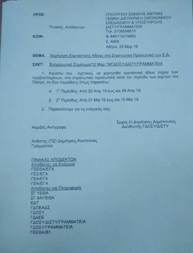 Η Πανελλήνια Ομοσπονδία Ενώσεων Στρατιωτικών (Π.ΟΜ.ΕΝ.Σ.) ζήτησε από το ΥΠΕΘΑ την εξέταση για άμεση έκδοση της διαταγής χορήγησης της ειδικής εορταστικής άδειας για την περίοδο του Πάσχα, προκειμένου τα στελέχη των Ενόπλων Δυνάμεων να προβούν στην έγκαιρη εξεύρεση οικονομικών εισιτηρίων, με το μέσο μεταφοράς της επιλογής τους.