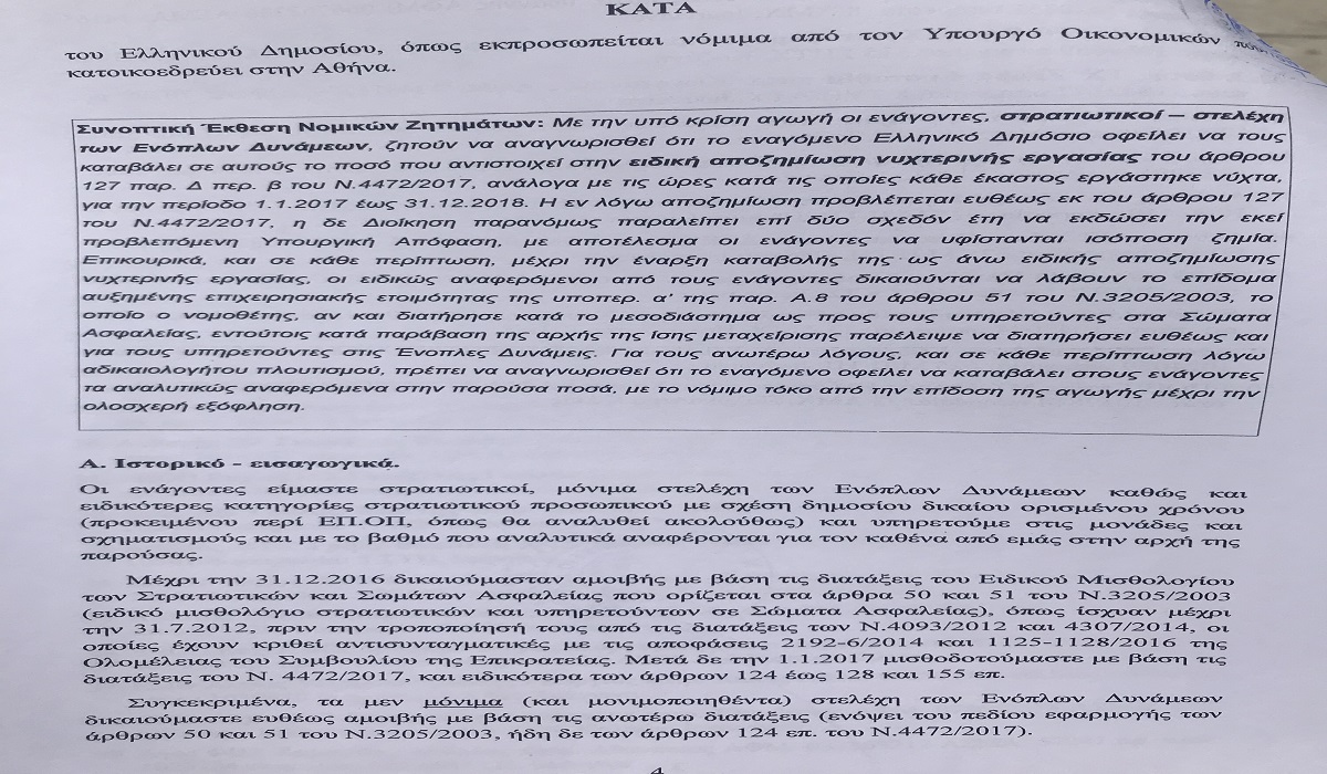Κατατέθηκαν σήμερα οι πρώτες αγωγές στρατιωτικών για την διεκδίκηση της αποζημίωσης νυχτερινής απασχόλησης. Δύο χρόνια μετά την ψήφιση του νέου μισθολογίου του Ν.4472/2017, η αποζημίωση των νυχτερινών, το μοναδικό θετικό μέτρο που προέβλεψε ο νέος νόμος, παραμένει δυστυχώς κενό γράμμα.