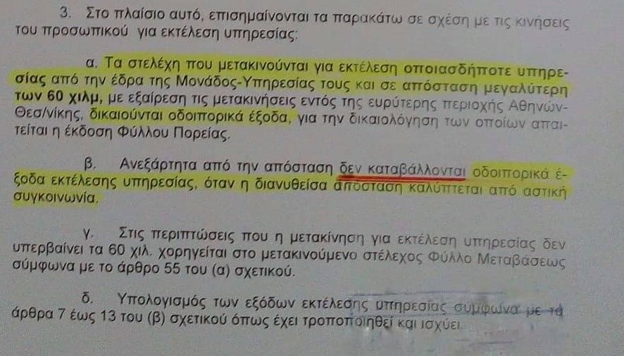 Σας γνωρίζουμε ότι με έγγραφο του ΓΕΣ υπενθυμίζεται η εφαρμογή των διατάξεων για τις αυθημερόν μετακινήσεις, του στρατιωτικού προσωπικού που μετακινείται σε απόσταση από 60χλμ και άνω από την έδρα της υπαγόμενης Μονάδας – Υπηρεσίας του, αποζημίωση η οποία σε πολλές περιπτώσεις δεν καταβάλλονταν μέχρι σήμερα στο στρατιωτικό προσωπικό και δεν εφαρμόζονταν, η νόμιμη διαδικασία για την έγκριση της κίνησης και την έγκαιρη έκδοση των σχετικών Φύλλων Πορείας.