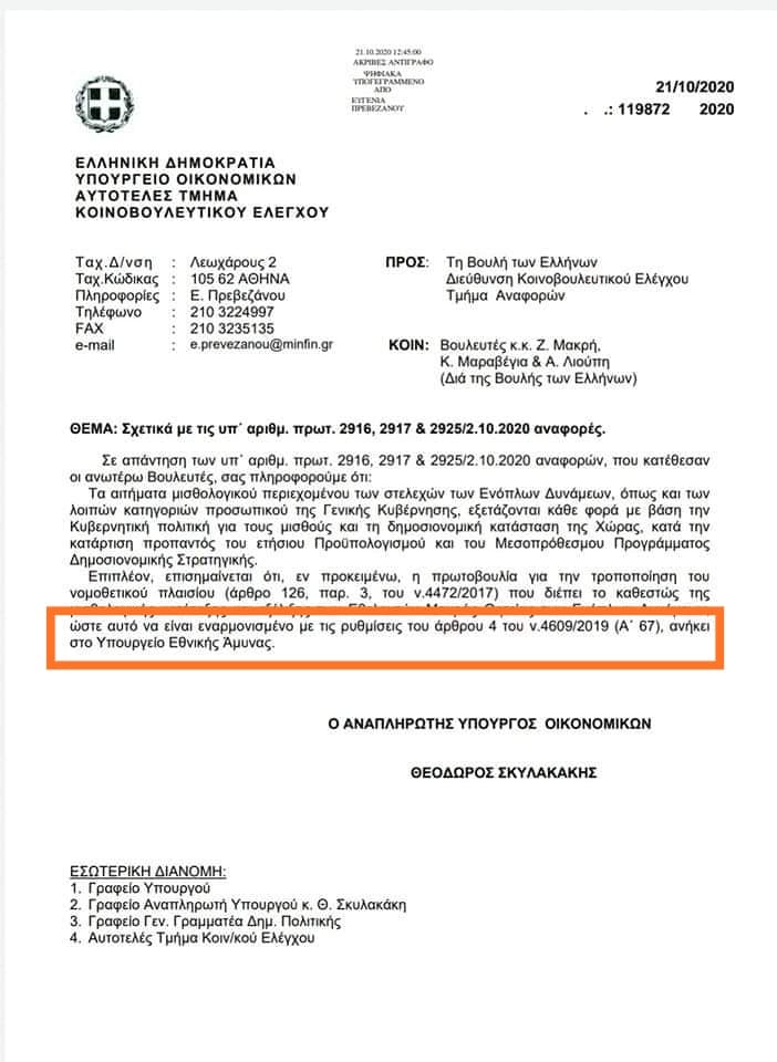 4. Οι πρόσφατες απαντήσεις σε σχετική ερώτηση βουλευτών της Αντιπολίτευσης με θέμα «Αδικαιολόγητη μισθολογική ανισότητα των ΕΜΘ μετά την ψήφιση του ν.4609/2019», τόσο του Υπουργού Εθνικής Άμυνας ότι:
