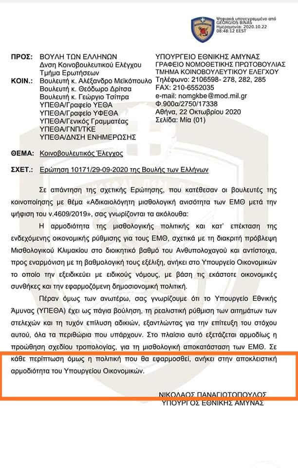 «Τα αιτήματα μισθολογικού περιεχομένου των στελεχών των Ενόπλων Δυνάμεων, όπως και των λοιπών κατηγοριών προσωπικού της Γενικής Κυβέρνησης, εξετάζονται κάθε φορά με βάση την Κυβερνητική πολιτική για τους μισθούς και τη δημοσιονομική κατάσταση της Χώρας, κατά την κατάρτιση προπαντός του ετήσιου Προϋπολογισμού και του Μεσοπρόθεσμου Προγράμματος Δημοσιονομικής Στρατηγικής. Επιπλέον, επισημαίνεται ότι, εν προκειμένω, η πρωτοβουλία για την τροποποίηση του νομοθετικού πλαισίου (άρθρο 126, παρ. 3, του ν.4472/2017) που διέπει το καθεστώς της μισθολογικής κατάταξης- εξέλιξης των Εθελοντών Μακράς Θητείας των Ενόπλων Δυνάμεων ώστε αυτό να είναι εναρμονισμένο με τις ρυθμίσεις του άρθρου 4 του ν.4609/2019 (Α’ 67), ανήκει στο Υπουργείο Εθνικής Άμυνας.»