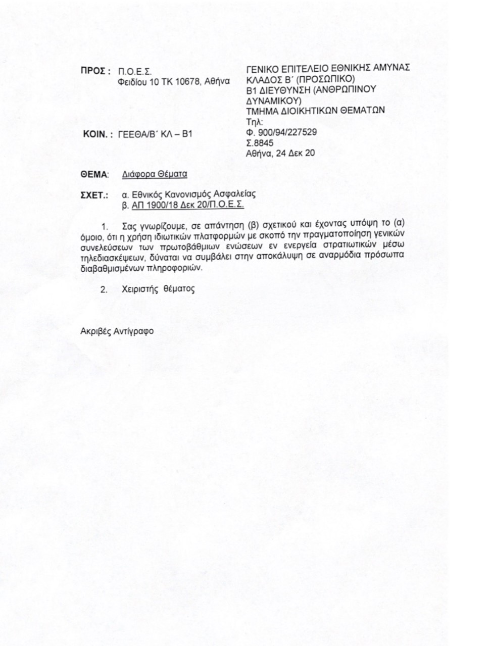 1. Περιήλθε σε γνώση μας, με αφορμή ανακοίνωση σωματείου, το σχετικό έγγραφο του ΓΕΕΘΑ/Β΄ ΚΛ, σύμφωνα με το οποίο «η χρήση των ιδιωτικών πλατφορμών, χωρίς τη φυσική παρουσία των μελών, με σκοπό την πραγματοποίηση γενικών συνελεύσεων μέσω τηλεδιασκέψεων, δύναται να συμβάλει στην αποκάλυψη σε αναρμόδια πρόσωπα διαβαθμισμένων πληροφοριών».