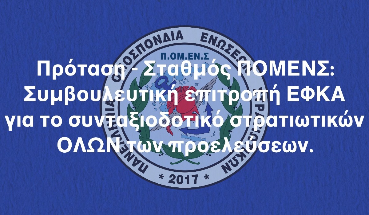 Η Πανελλήνια Ομοσπονδία Ενώσεων Στρατιωτικών – ΠΟΜΕΝΣ, μελετώντας όλα τα θέματα που άπτονται και σχετίζονται με την επίλυση προβλημάτων του εν ενεργεία στρατιωτικού προσωπικού, παρακολουθεί τις εξελίξεις, παρεμβαίνοντας με προτάσεις για την ανάδειξη – ενημέρωση όλων των εμπλεκομένων φορέων.