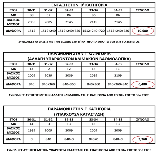 3. Στους παρακάτω πίνακες μπορούμε να διαπιστώσουμε πλήρως τον εμπαιγμό ο οποίος επιχειρείται με την «βάφτιση» των ήδη υπαρχόντων κλιμακίων της Γ΄ Κατηγορίας ως δήθεν μισθολογική αποκατάσταση, καθόσον επιχειρείται με αλχημείες η απομείωση και το ψαλίδισμα της δικαιούμενης μισθολογικής τους προαγωγής ως ισότιμοι Αξιωματικοί έναντι άλλων Αξιωματικών μη παραγωγικών Σχολών. Συγκεκριμένα βλέπουμε, τις συνολικές αυξήσεις με την είσοδο των Αξιωματικών στην Β’ κατηγορία από το 30ο έτος έως το 35ο έτος και τα ποσά που προκύπτουν σε σχέση με την προτεινόμενη διάταξη του Σχεδίου Νόμου καθώς και την υπάρχουσα κατάσταση όπου αποζημιώνονται ως Υπαξιωματικοί.