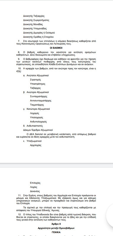 - Σύμφωνα με ΠΔ 130/84 (20-1) οι βαθμοί είναι συγκεκριμένοι χωρίς να περιέχουν οποιοδήποτε πρόθεμα, καθώς αυτό μεταβάλει την ιδιότητα του στρατιωτικού, δημιουργώντας αυτόματα αίσθημα διαφορετικότητας μεταξύ των Στελεχών. Άλλωστε από τους αριθμούς μητρώων των υπογραφόντων συναδέλφων στρατιωτικών, είναι παραπάνω από εμφανής η πηγή προέλευσης κάθε στελέχους. Αξίζει να αναφερθεί ότι συγκεκριμένη διάκριση, μέσω προθέματος, δεν υφίσταται στην άλλη κατηγορία μονιμοποιηθέντων εξ εθελοντών.