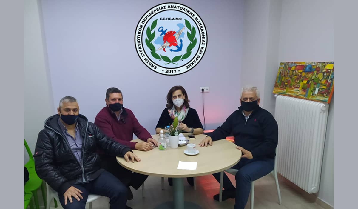 Η Ένωση Στρατιωτικών Περιφέρειας Ανατολικής Μακεδονίας και Θράκης (Ε.Σ.ΠΕ.Α.Μ/Θ), πραγματοποίησε στο πλαίσιο των επαφών της με τους θεσμικούς παράγοντες της Περιφέρειας συνάντηση με την Βουλευτή Δράμας του Κινήματος Αλλαγής (ΚΙΝ.ΑΛ.), κα Χαρά Κεφαλίδου, για την ανάδειξη των προβλημάτων που απασχολούν τους Έλληνες Στρατιωτικούς. Στην συνάντηση η οποία πραγματοποιήθηκε σε πολύ εγκάρδιο και φιλικό κλίμα παραβρέθηκε εκ μέρους του Δ.Σ. της Ένωσης, ο Πρόεδρος της Ε.Σ.ΠΕ.Α.Μ/Θ Νικόλαος Παναγιωτίδης, ο Αντιπρόεδρος Ευάγγελος Παπαβασιλείου και ο Ταμίας Χρήστος Μασάνης.