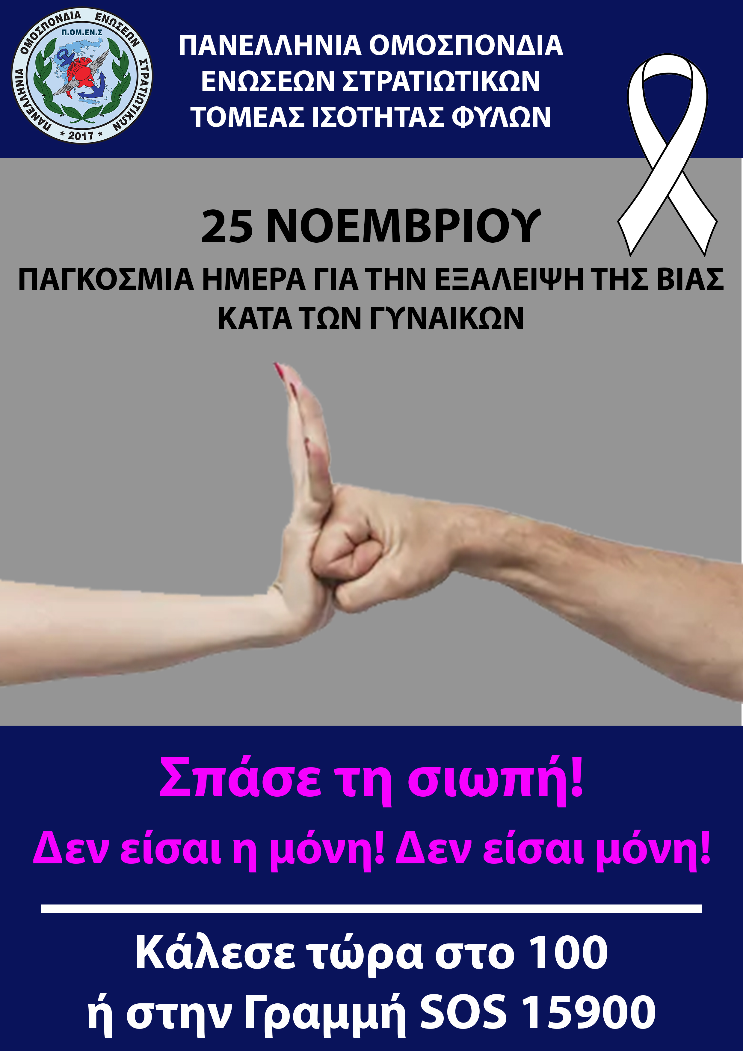 Η Πανελλήνια Ομοσπονδία Ενώσεων Στρατιωτικών και ο Τομέας Ισότητας των Φύλων της «ΠΟΜΕΝΣ» αγωνίζεται σταθερά για την προώθηση της ουσιαστικής ισότητας και την εξάλειψη των διακρίσεων λόγω φύλου και στηρίζει έμπρακτα τον κοινωνικό αγώνα κατά της έμφυλης βίας και της συγκάλυψής της.