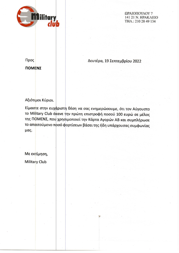 ΠΟΜΕΝΣ - MILITARY CLUB: ΜΟΝΑΔΙΚΗ Συνεργασία για τους Στρατιωτικούς και τις Οικογένειες τους