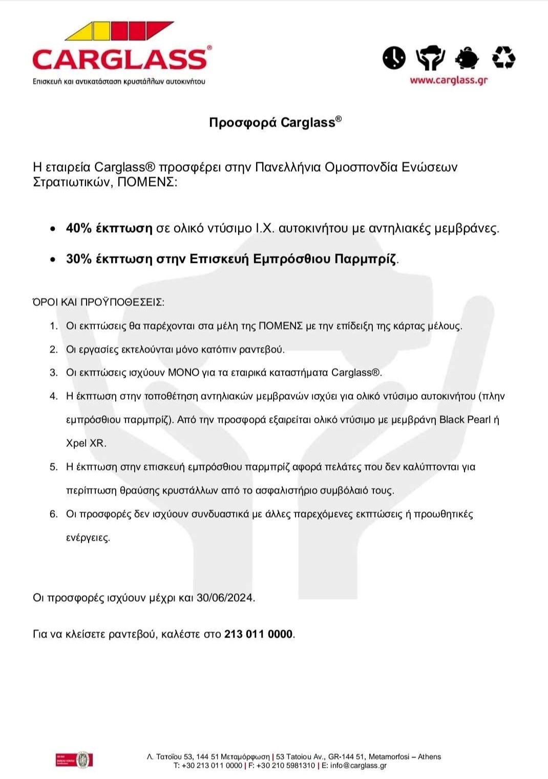 Η έκπτωση εξασφαλίζετε με την επίδειξη, από τα ενδιαφερόμενα μέλη μας, της Κάρτας Προσφορών της ΠΟΜΕΝΣ στα κατά τόπους καταστήματα της Carglass®